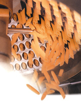 パスタのシコシコ・モチモチした食感は、小麦を水で練る際に発生する「グルテン」と呼ばれる成分に由来します。このグルテンを豊富に含むプレミア・アンバー・デュラム小麦を厳選し、練り上げていきます。練り合わせて出来た生地は、パスタのタイプによって、テフロンダイス(鋳型)とブロンズダイスに分けて加工しています。 ロングパスタは、通常テフロンダイスで仕上げることにより、グルテンの形状を壊さず、小麦のおいしさがそのまま味わえるよう加工します。パスタの一本一本に、コシが出てツルツル、シコシコした食感、茹で上げのアルデンテのおいしさに統一感すら感じさせてくれます。